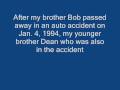 Description: A testimony of God's love and his answer to prayer.This video is in memory of my older brother Bob tragically taken from us in a 1994 auto accident and our Mother also shown in the two motorcycle frames. Mom died just 2 years after Bob and was buried to his right. In the 2nd to last frame are their head stones. Note the position of the pink rosebush that my sister planted on Mom's grave. This miracle was by God's hand, not ours. Brazzco Timeless Memories |